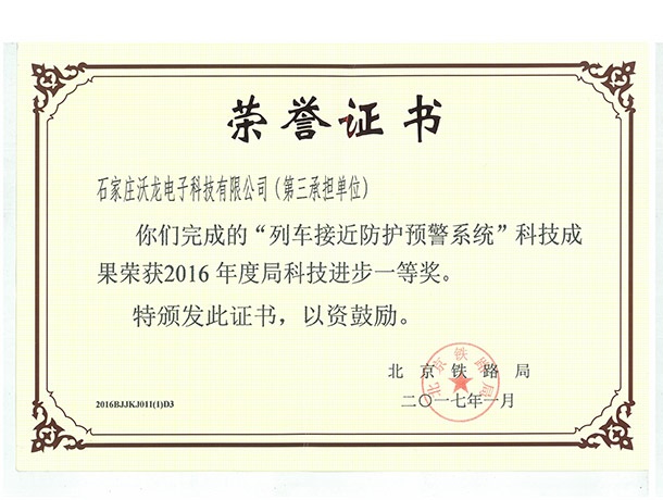 我司“列車接近防護預警系統”榮獲中國鐵路北京局集團有限公司2016年度科技進步一等獎。